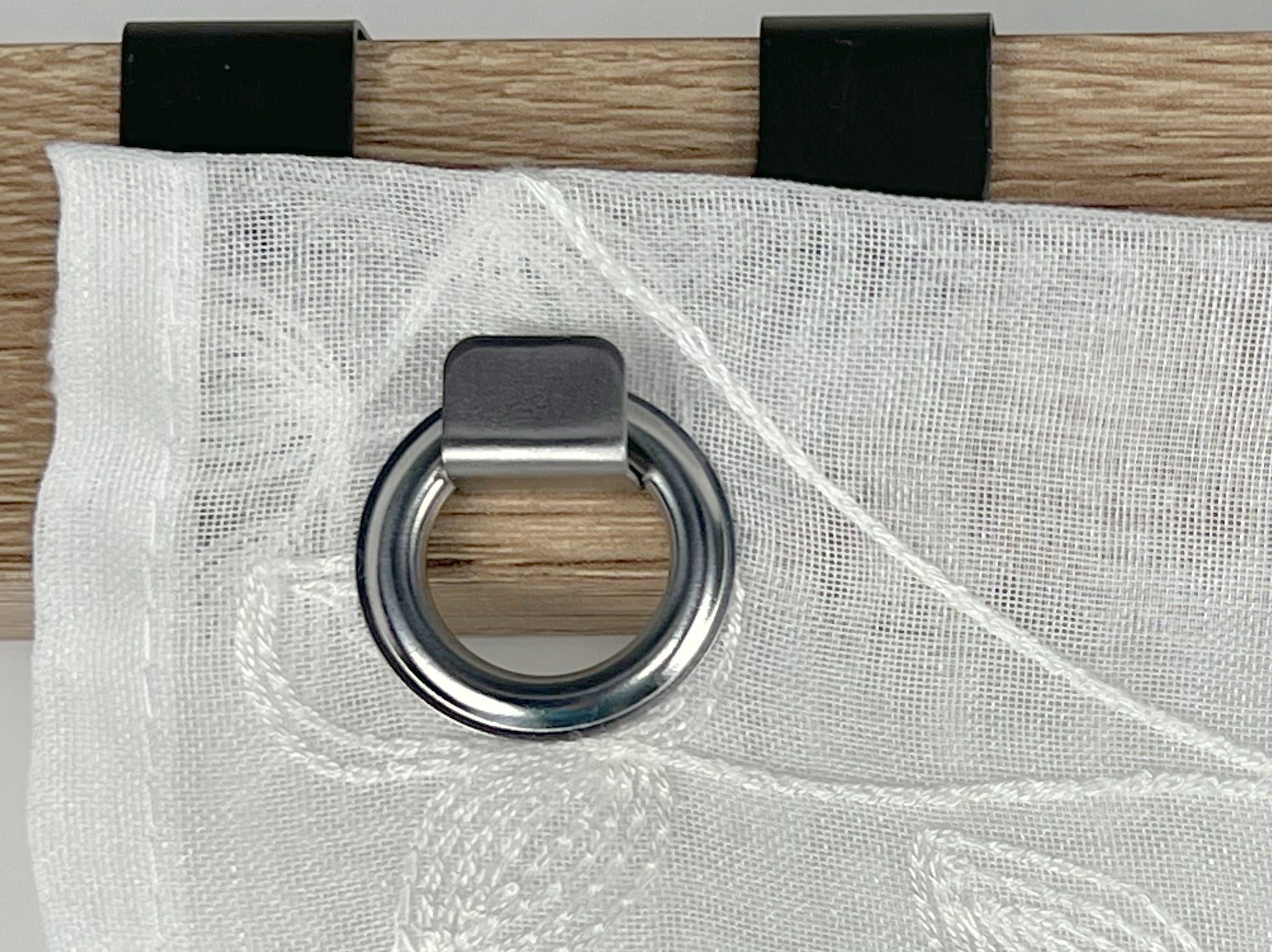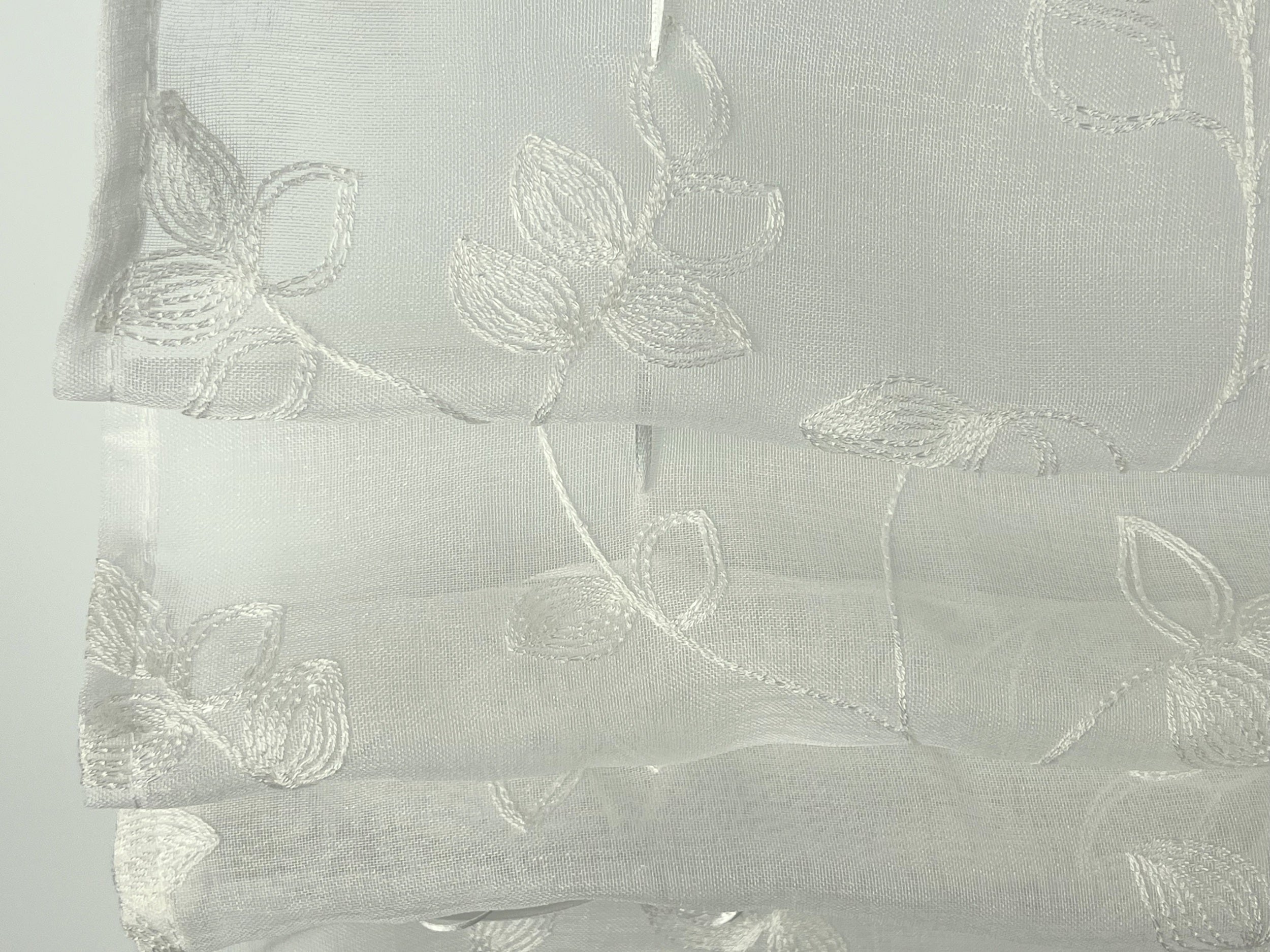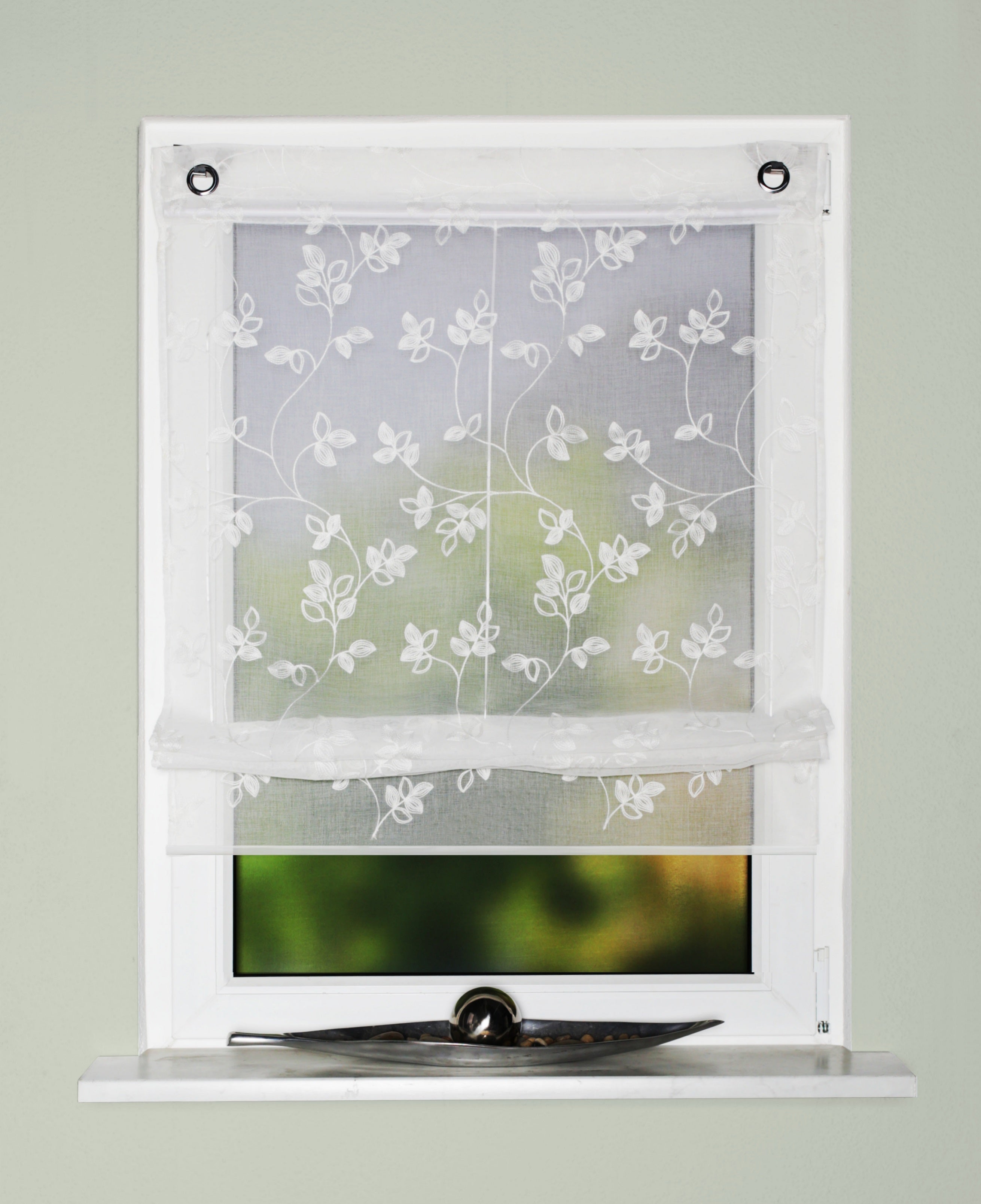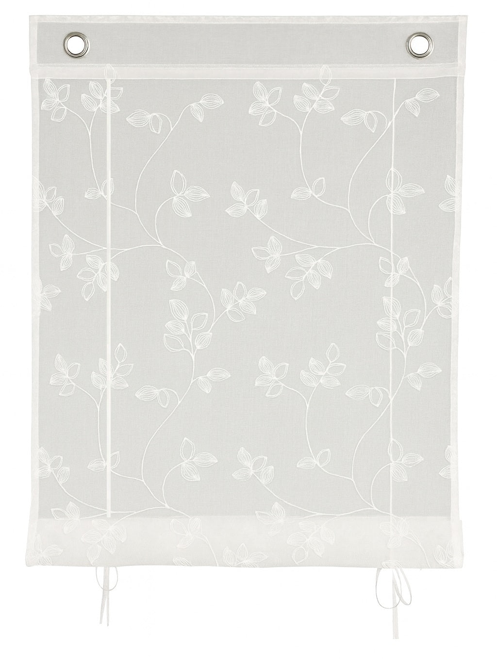 Dieses hochwertige Ösen-Bändchenraffrollo überzeugt durch seine elegante, halbtransparente Grundware mit feiner Leinenstruktur und einer dekorativen floralen Stickerei in klassischem Weiß. Mit den Maß B x H von 45, 60, 80 und 100cm x 130 cm eignet es sich ideal für schmale Fenster und sorgt für eine freundliche, lichtdurchlässige Atmosphäre, ohne auf leichte Privatsphäre zu verzichten. Das Raffrollo lässt sich dank der integrierten Ösen und der im Lieferumfang enthaltenen Fensterhaken schnell und unkompliziert direkt am Fensterrahmen anbringen – ganz ohne Bohren und damit besonders schonend für Ihre Fenster. Die eingearbeitete Stoppertechnik ermöglicht es, das Bändchenrollo flexibel auf jede gewünschte Höhe zu dekorieren. Zwei zusätzliche Beschwerungsstangen sorgen für einen optimalen Fall des Stoffes und ein gepflegtes Erscheinungsbild. Gefertigt aus 100 % Polyester ist das Rollomodell pflegeleicht und kann bei 30°C gewaschen werden. Geliefert wird ein Raffrollo inklusive sämtlichem Zubehör, sodass einer sofortigen Montage nichts im Wege steht.